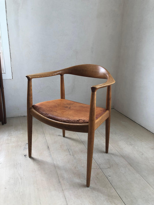 Hans Wegner Round Chair of Oak and Patinated Cognac Leather