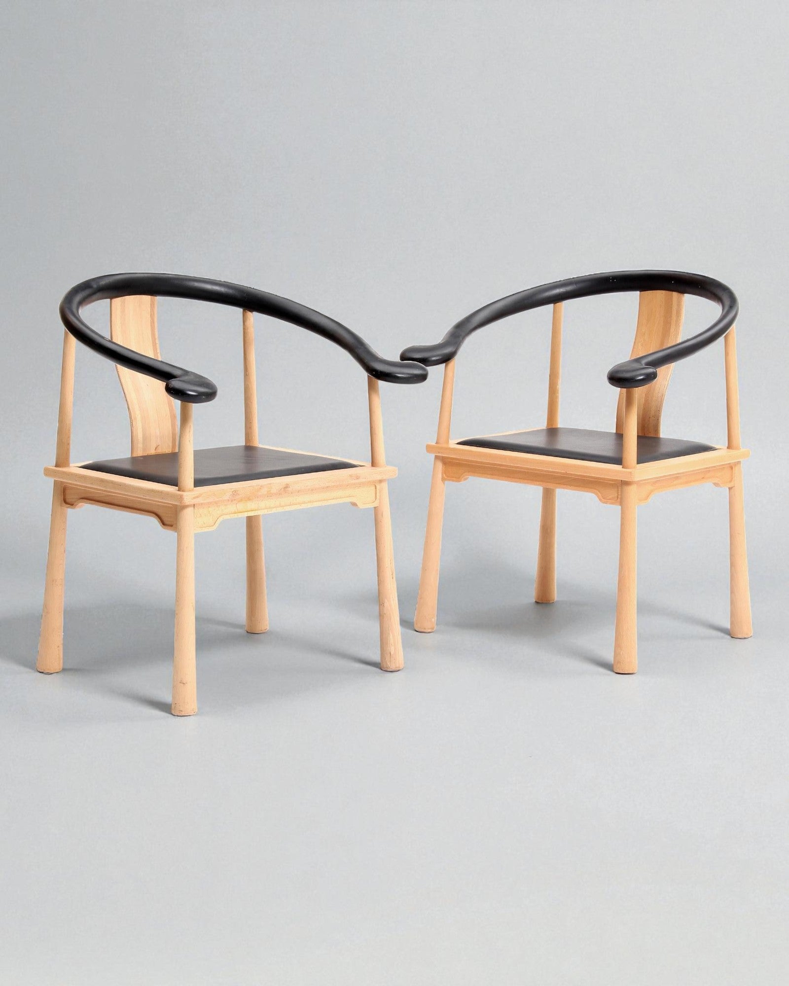 A pair of 1960s Richard Nissen “Yin” beech China chairs with club shaped legs, loose seat with black Leather. The armchair is made from an old Chinese principle. The top rail is made from a total of six parts with wedges. Total production of the chairs is under 100 units. Provenance: The Richard Nissen collection.Manufactured by Richard Nissen, Langaa. h72 w68 d65CM