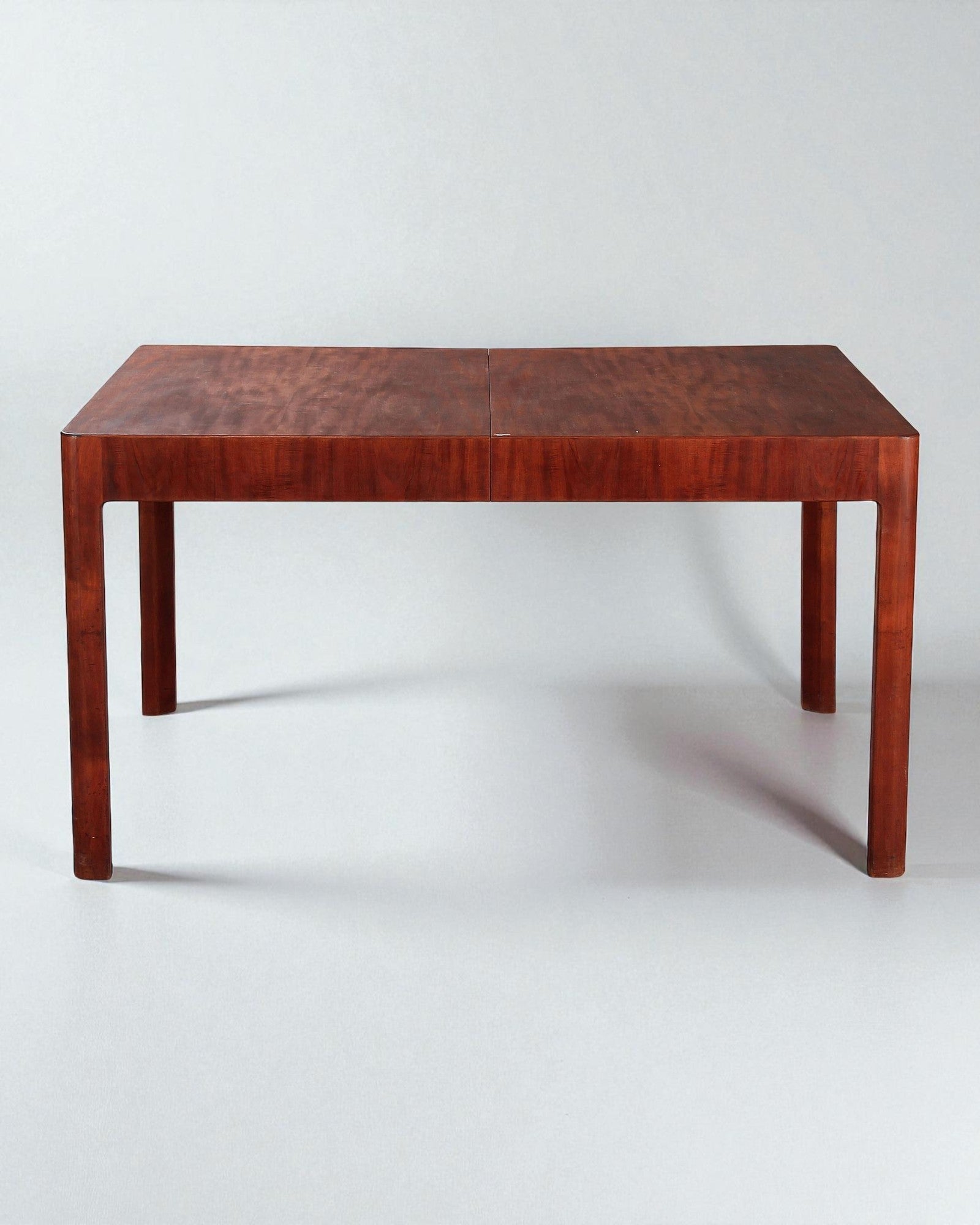 Rectangular dining table made of padouk wood with extension for three pine leaves (the pine leaves are of a different wood type and colour and assume a table cloth is used when extended). Made circa 1930s by cabinetmaker Jørgen Christensen. L. 140./308 cm. W. 100 cm. H. 75 cm. Similar table with same type of legs and rail designed by Helweg-Møller, manufactured by Jørgen Christensen for Berlingske Hus, 1930. Literature: Tidskriftet “Arkitekten” 1930, pp. 161–192.