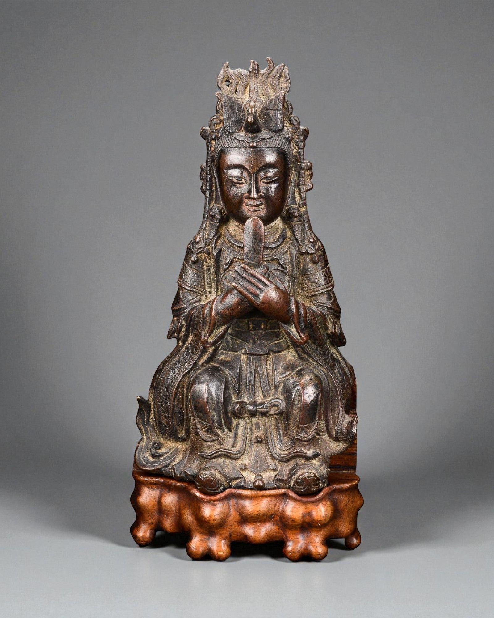 Bixia Yuanjun figure of bronze dated Ming Dynasty 1368-1644. Base of hardwood. Height excluding base 26cm; Heigh including base 31cm. Condition: Corrosion on reverse/back; Crown missing pieces; Gilt worn off. Provenance: Brunn Rasmussen Auctioneers, Auction 727, Catalogue 1129. Professor...