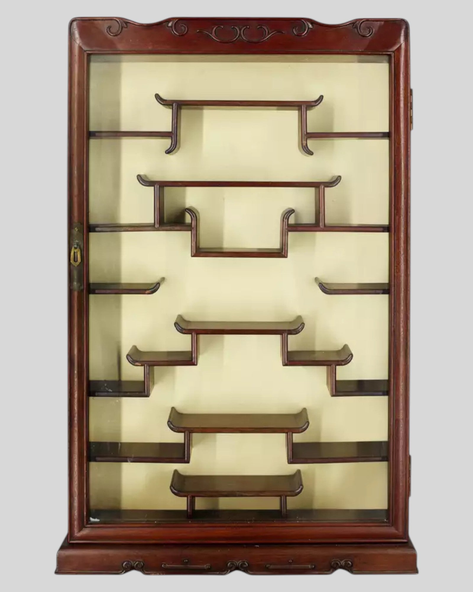A Chinese wood display cabinet, 20th century, with single glazed door enclosing arrangement of shelves, 85x51cm