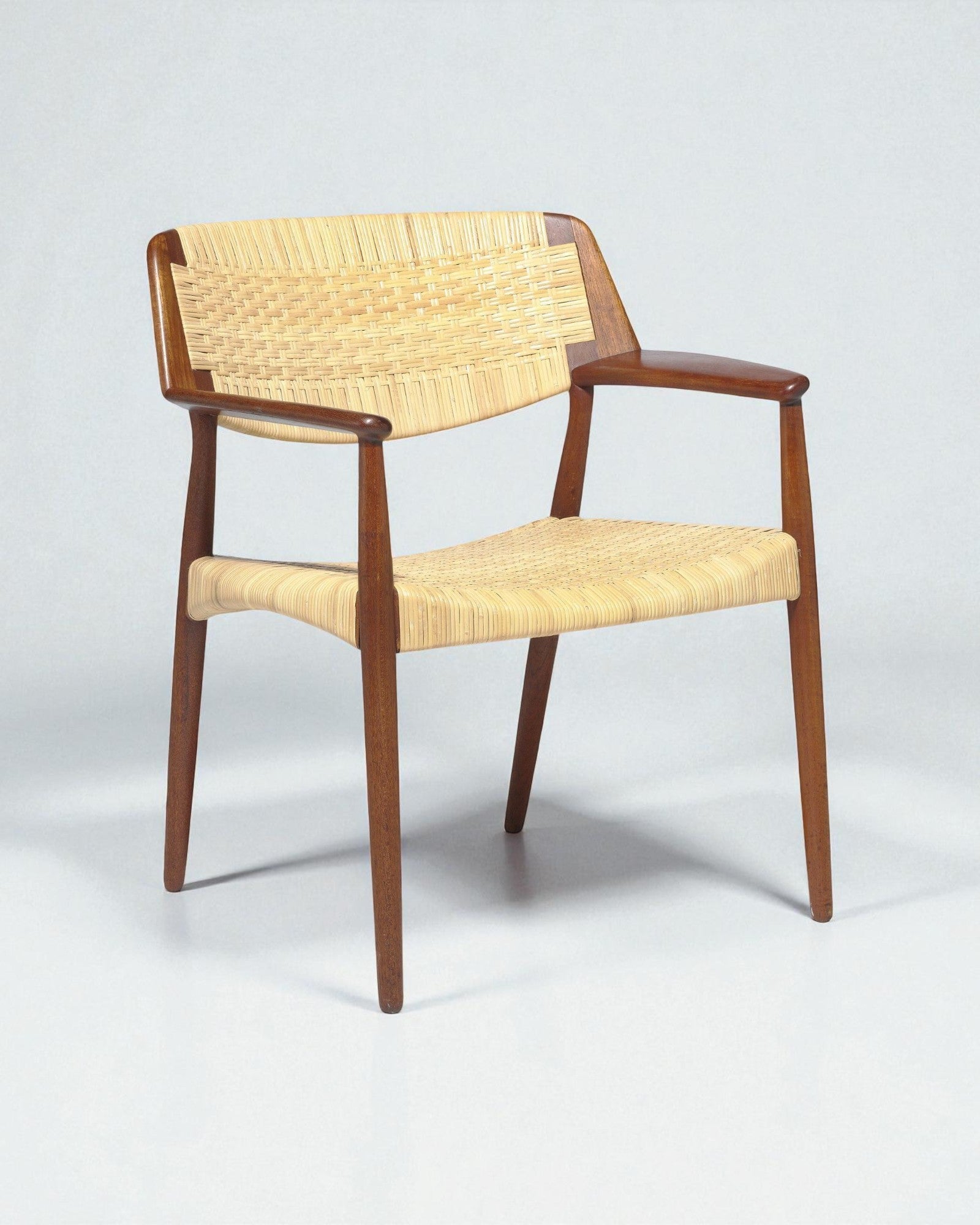 A rare teak armchair designed by Ejnar Larsen and Aksel Bender Madsen. Seat and back with woven cane. Designed 1955.