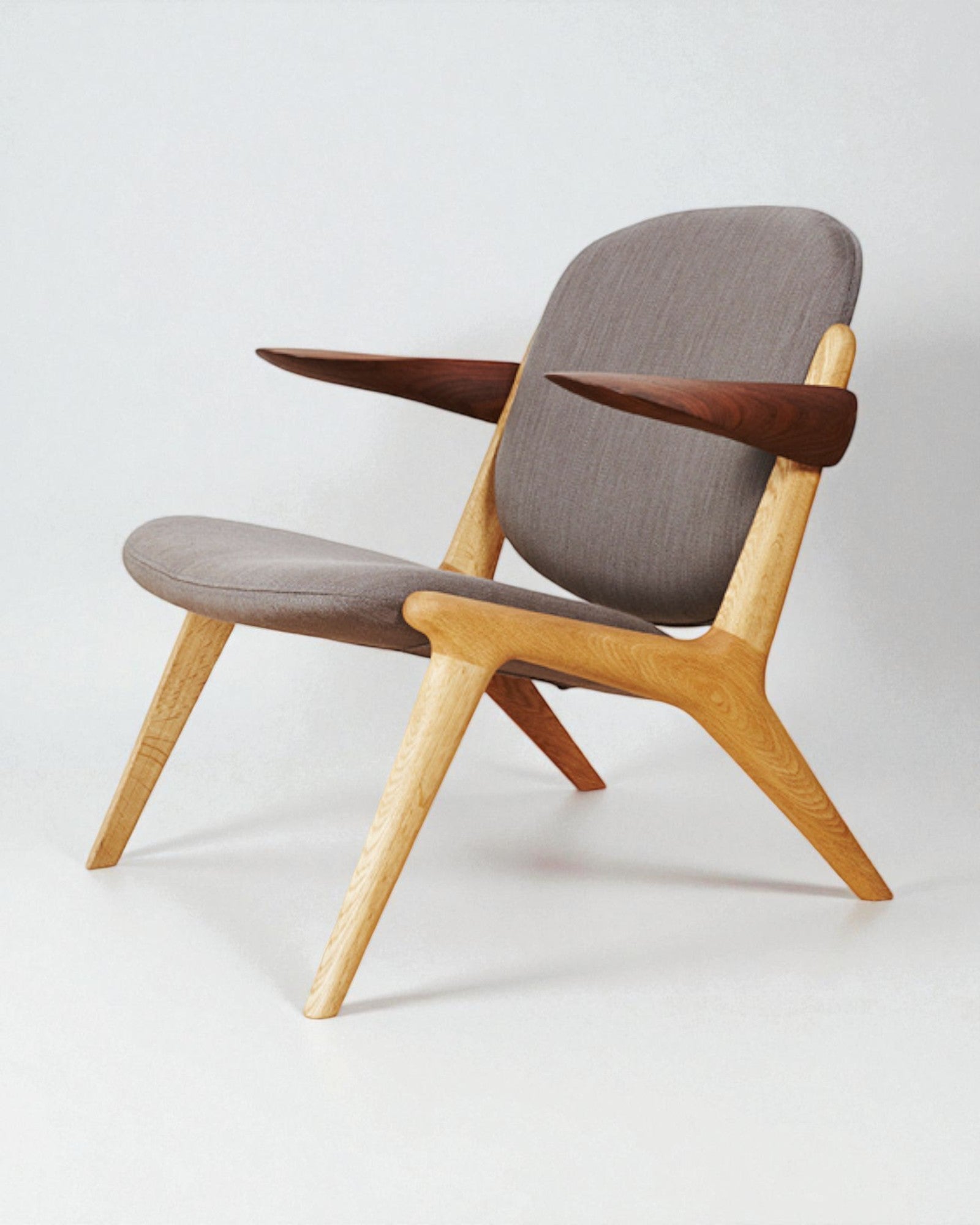 This chair with oak frame and walnut arms is available from stock. By selecting leather, fabric or boucle, a customised upholstery is available.