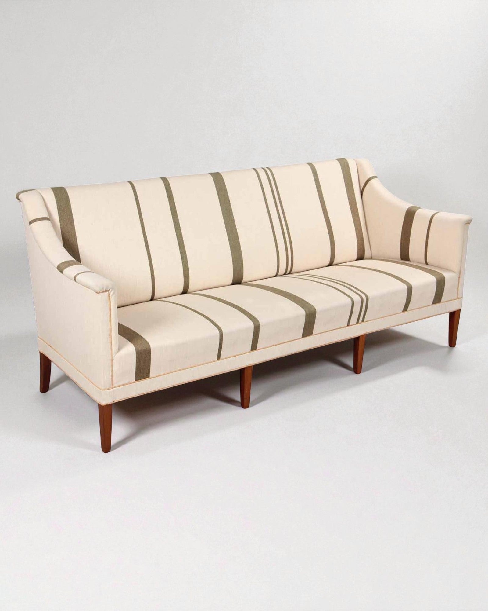 Three-seater sofa with eight tapering mahogany legs. Sides, seat and back upholstered with striped savak wool presumably in the last 10-20 years with natural leather pipings. Model 6092. Designed 1940. Made by Rud. Rasmussen Cabinetmakers.