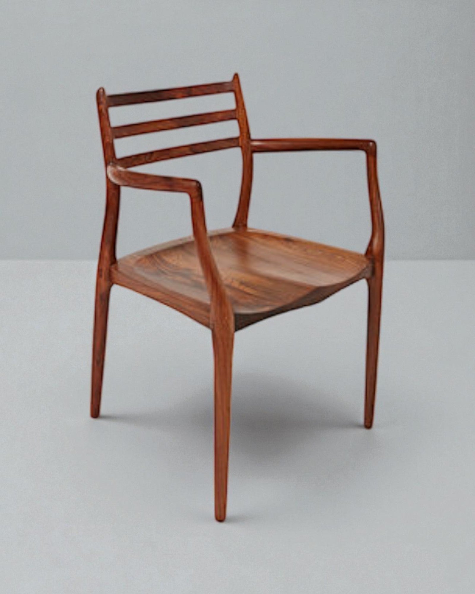 The original Model 62 was designed in 1962 by Niels Otto Moller with a leather or fabric seat. Oliver Olsen designed a Paere Dansk edition of Model 62 using a seat made of 100% solid rosewood.