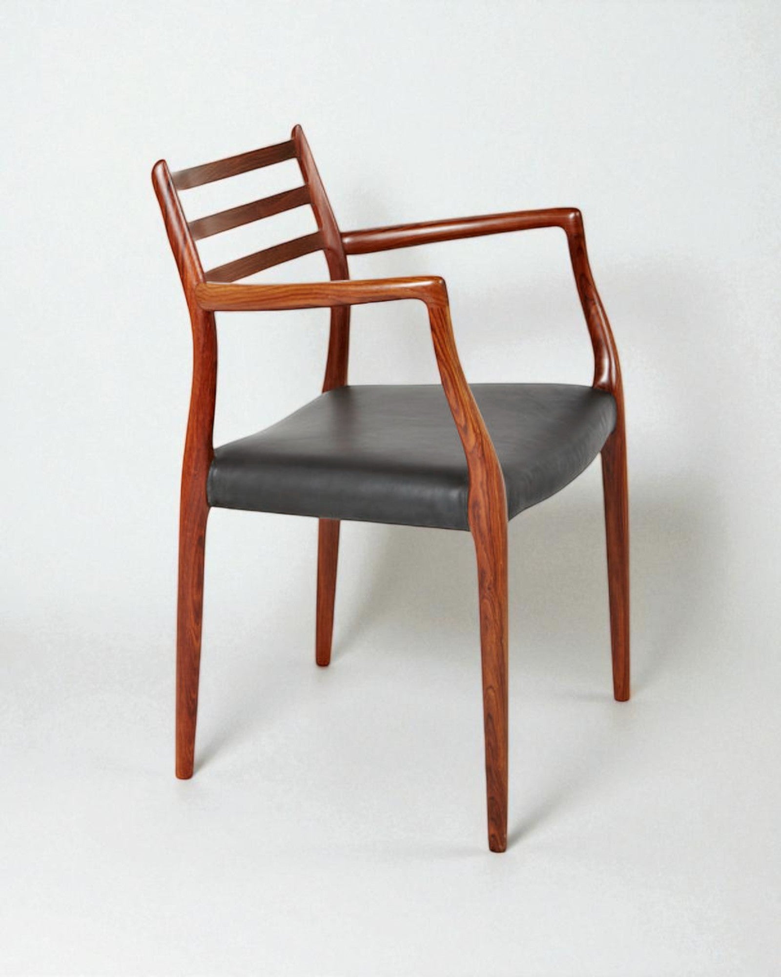 The frame of this model 62 is made in Denmark by JL Moller but hand-detailed and finished by Paere Dansk in London. The special detailing shapes the chair to more closely resemble the original 1962 carvers made by JL Moller during the 1960s. The upholstery is also done in London, allowing for customer ordered material.