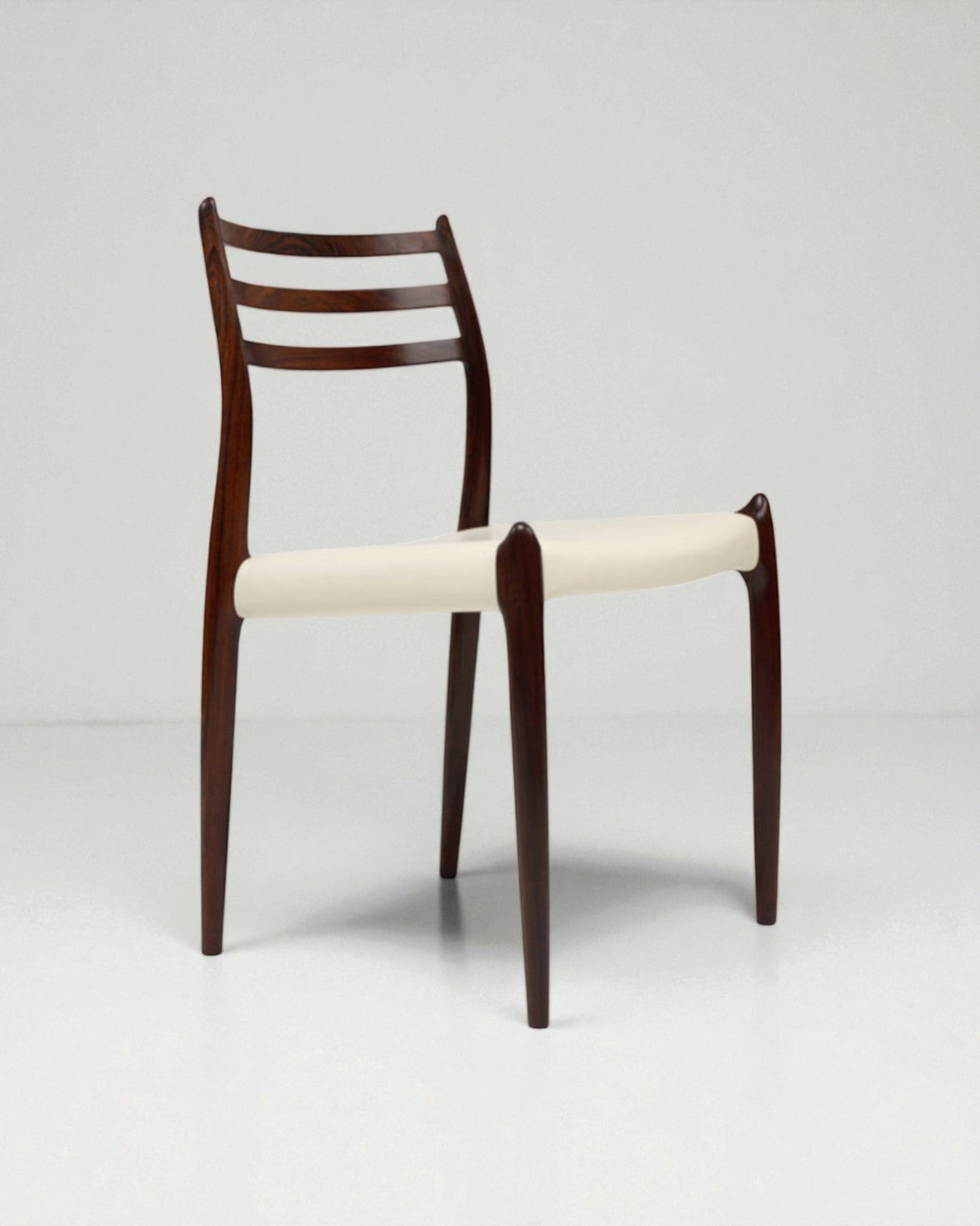 Paere Dansk holds in stock a number of vintage rosewood dining chairs designed by Niels Otto Moller in 1962 and made before 1970. About 1970, timber agents in Denmark stopped importing rosewood from Brazil and replaced this source with rosewood from India. The scientific name for Brazilian rosewood is dalbergia nigra, or "black" rosewood. Whereas Indian rosewood is generally a red-brown, Brazilian rosewood offers dark-brown frames that can be near black when sanded down to restore original appearance. Paere Dansk as a principal does not use stains or other colouring on wood unless requested byu the buyer.