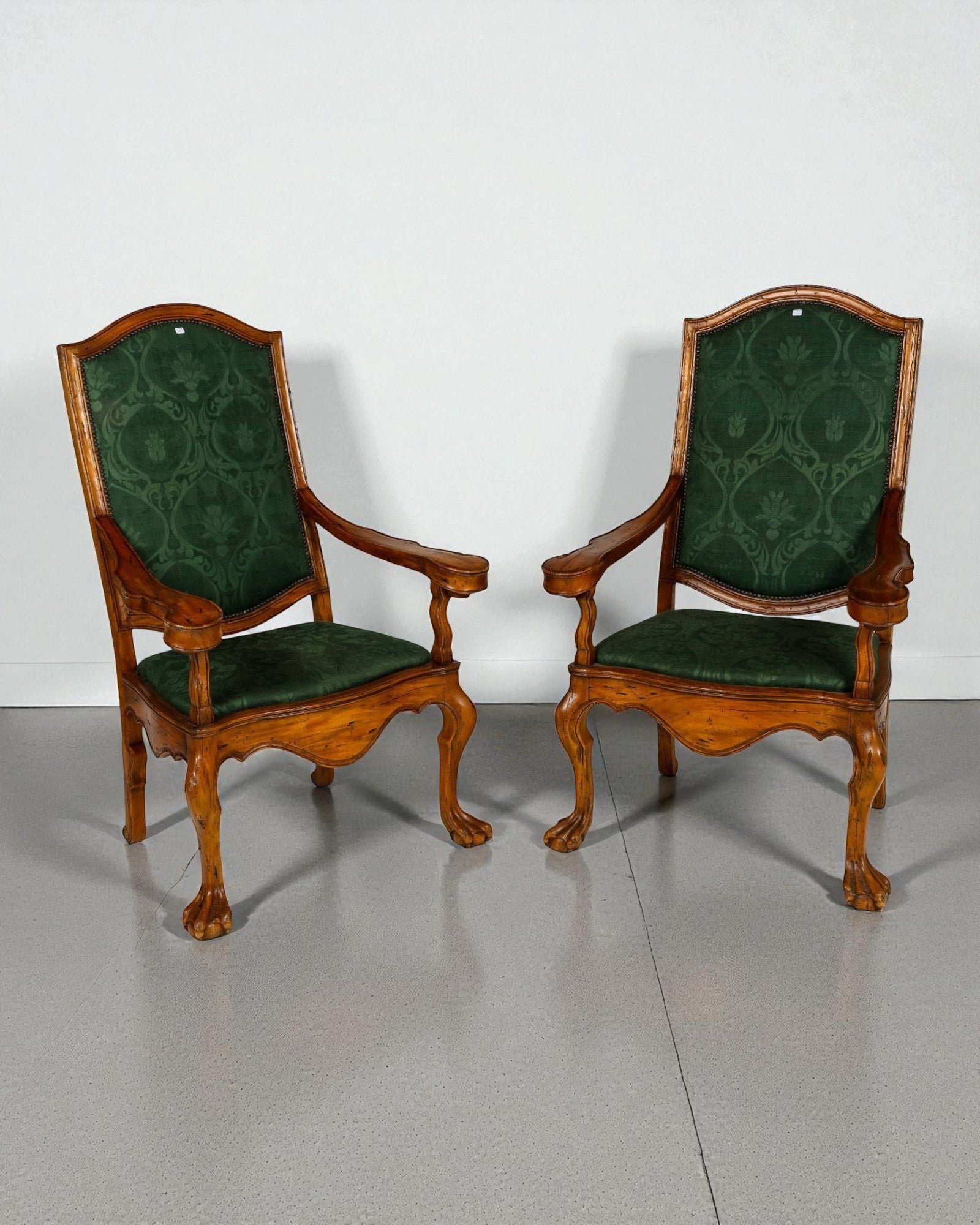 Pair of large armchairs in light natural wood with high backs, scrolled arm brackets, front legs with claw feet resting on spheres.
