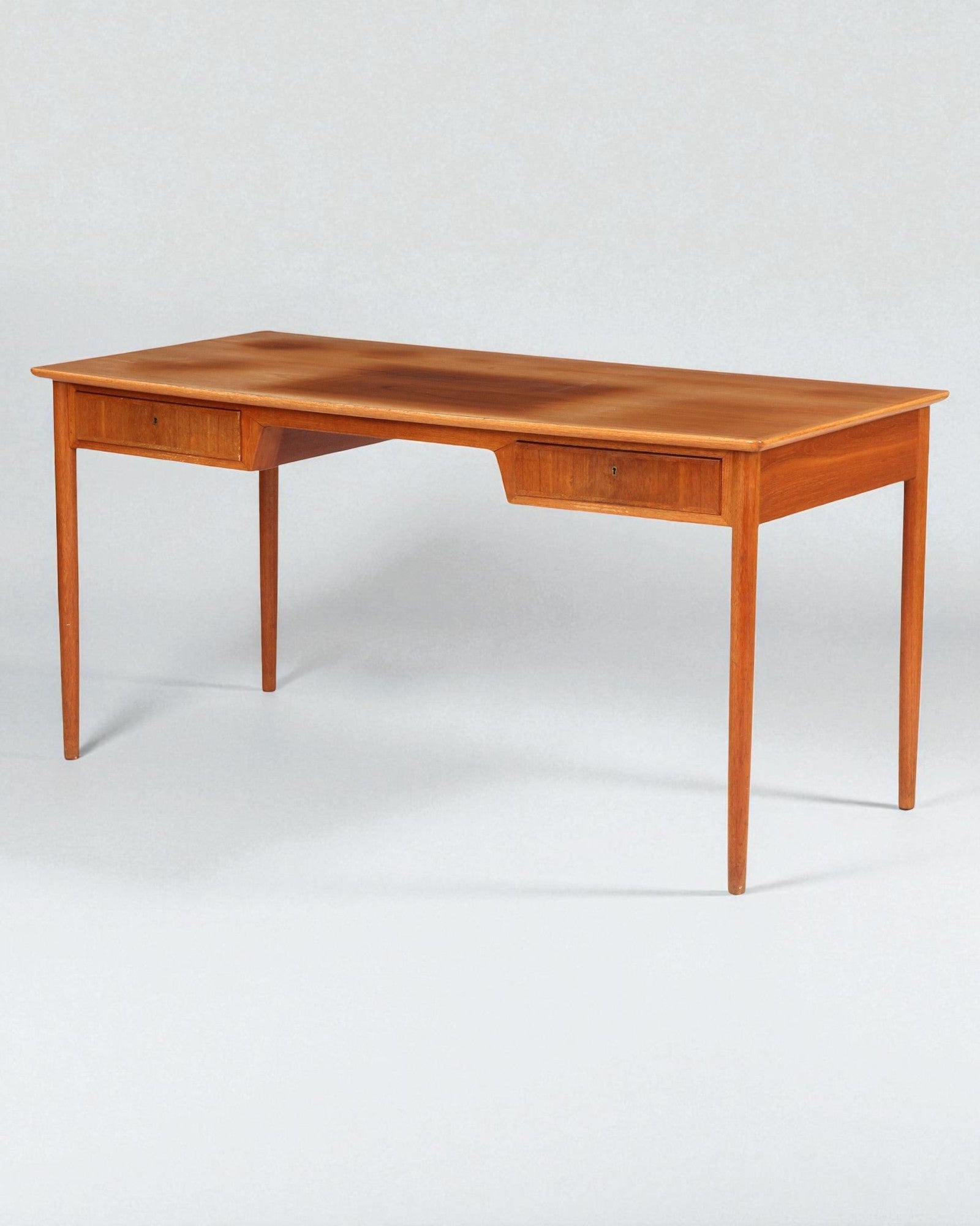 Erik Kirkegaard: Desk of teak. Front with two drawers. Made by cabinetmaker Gustav Bertelsen. H. 74 cm. L. 150 cm. W. 75 cm. List Price of £4200 includes professional sanding and re-polishing of top to return top to uniform colour.