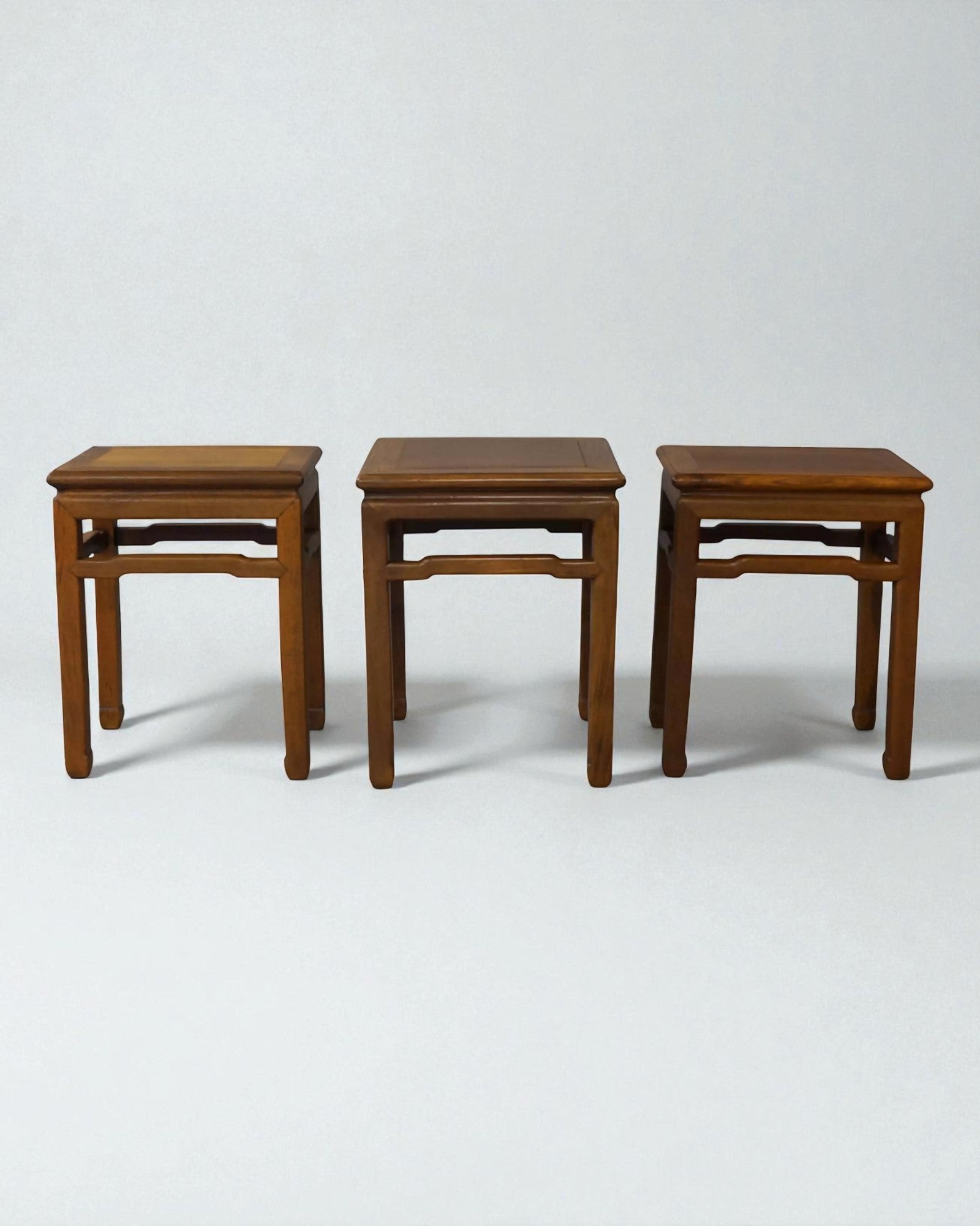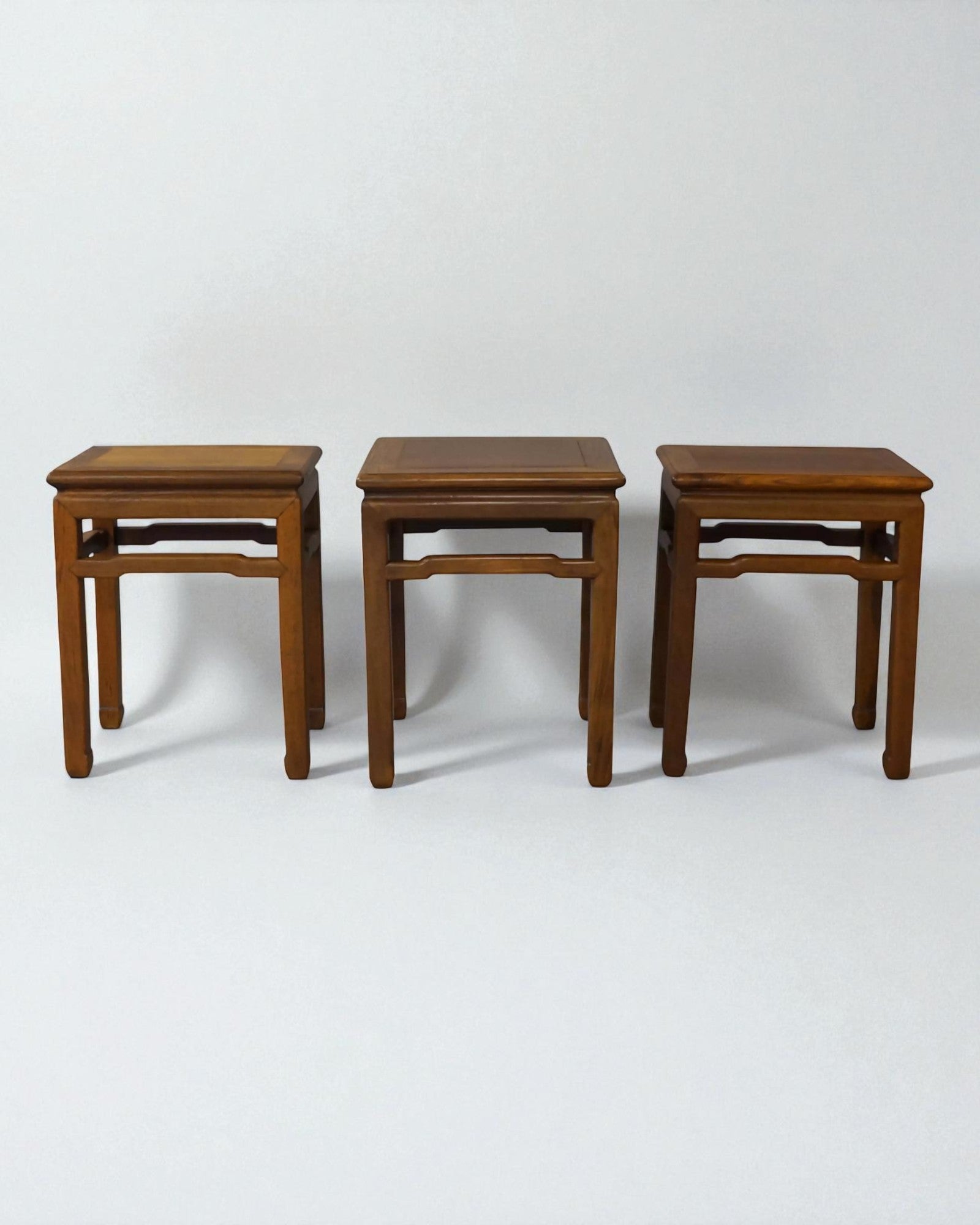 A set of three Chinese rosewood stools, 20th century, each similarly carved with a flat top set in a frame supported by four square legs with rounded corners terminating in tapered feet, joined by four humpbacked stretchers, 41.5cm x 31.5cm x 51cm. (3)